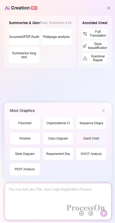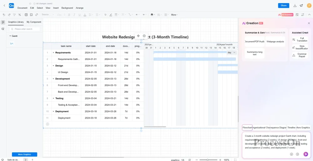 ProcessOn AI is specially trained to generate Gantt charts with reasonable task structures, scientific time scheduling, and correct dependencies, which can be directly used for project reporting and progress tracking.