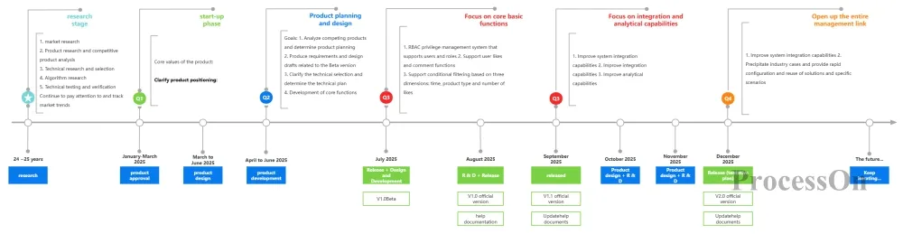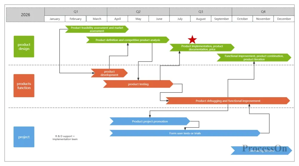 Go to ProcessOn , search for the keyword [product roadmap], use the template, and then enter the flowchart maker to edit it. Improve the timeline, product features, risk description, and other modules.