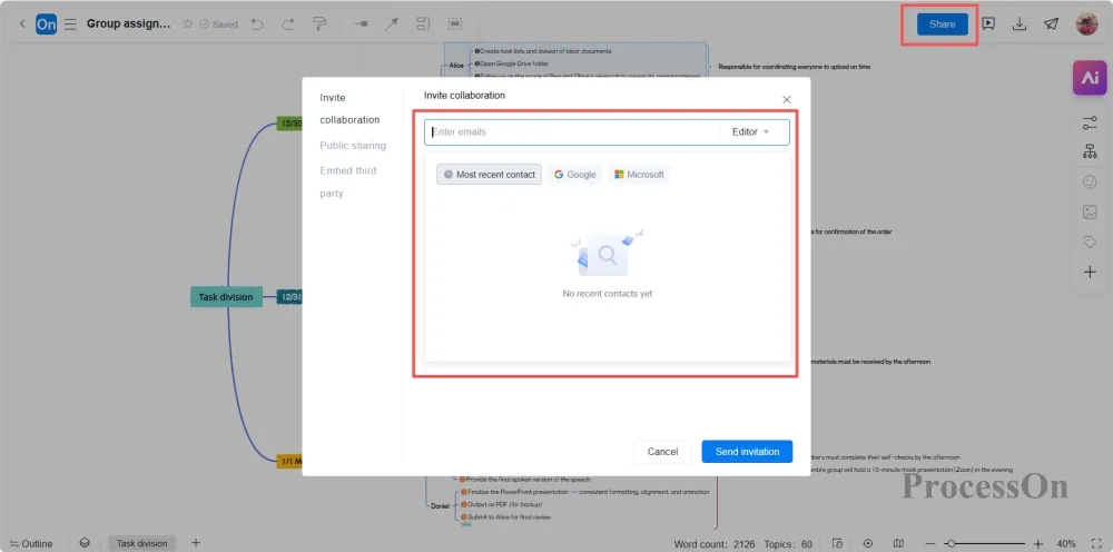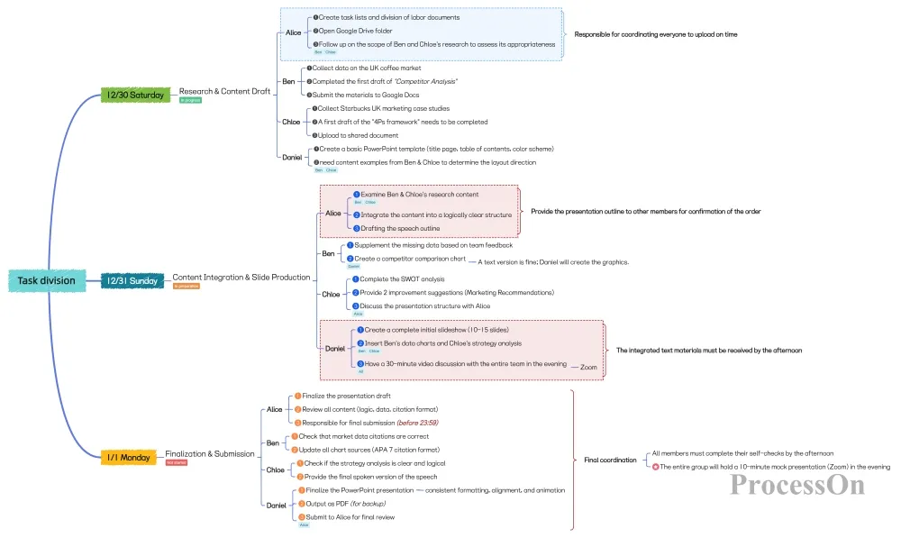 Use ProcessOn's mind mapping feature to break down tasks ; this can be done using tree diagrams, organizational charts, or basic mind maps.