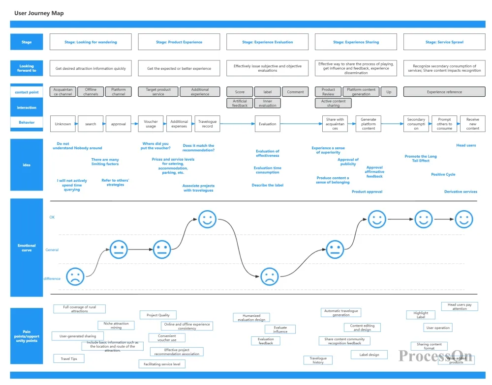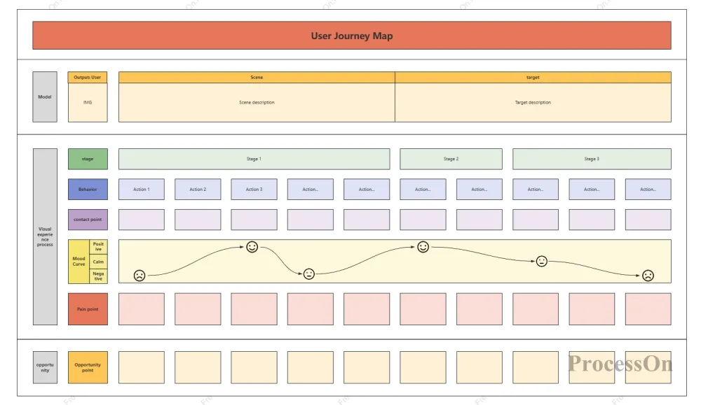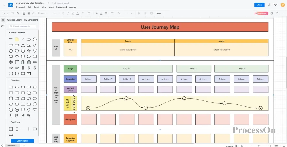 ProcessOn offers a wealth of user journey map templates and AI-assisted generation features. You can create journey map frameworks with a single click, quickly add elements such as user roles, touchpoints, and emotion curves, and support real-time collaborative editing by your team. Whether you want to streamline existing processes or plan entirely new experiences, you can find efficient tools to support you here.