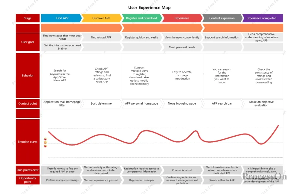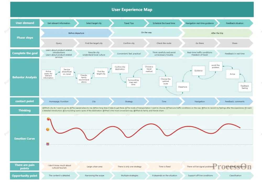 Visualize the user's emotional fluctuations throughout the journey—excitement, confusion, frustration, and surprise. The peaks and troughs of emotion often provide direct clues to discovering pain points and opportunities.