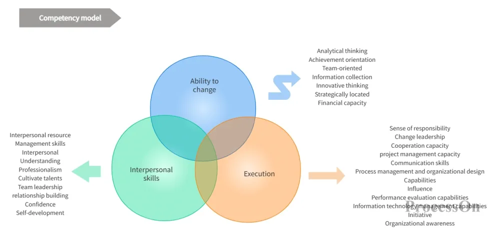 The core of a competency model is defining the abilities and qualities required for a position. A scientific competency model should cover multiple dimensions of ability to ensure that talent can fully meet the job requirements. The diagram below illustrates the three core competency dimensions of a competency model: change management, interpersonal skills, and execution skills, providing a clear framework for building a comprehensive competency model.
