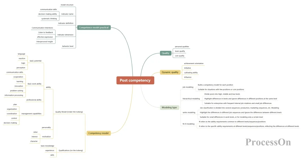 Visual charting tools help us more clearly organize the logical structure of competency models, transforming abstract skills and qualities into intuitive graphical information, thus improving communication and comprehension efficiency. These professional charts can be easily created using tools like ProcessOn . As an online graphical representation tool, ProcessOn supports various chart types, including flowcharts, mind maps, and UML diagrams, helping users quickly organize their thoughts, visualize complex information, and improve communication efficiency. It is suitable for multiple scenarios such as product design, project management, technical architecture, and business processes.