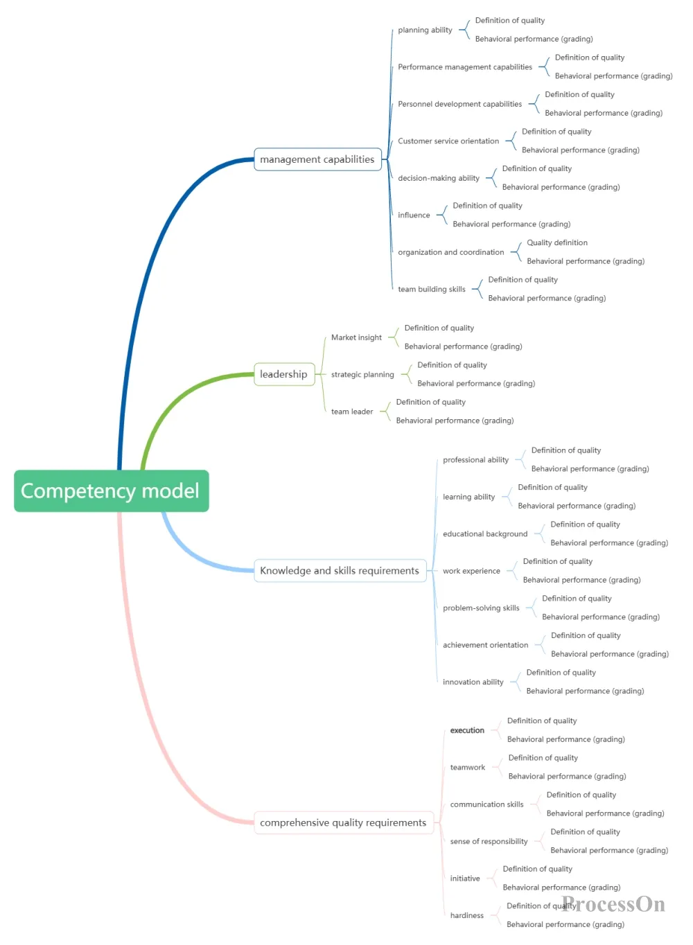 This tiered and detailed competency model is highly practical, helping companies transform abstract skills and qualities into concrete behavioral standards, providing a clear basis for talent recruitment, performance management, training and development, and other processes. When creating such mind maps using ProcessOn , we can select a suitable mind map template from the template library, and then modify and improve it according to the specific needs of the company, adding custom competency dimensions and behavioral standards.