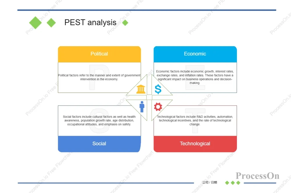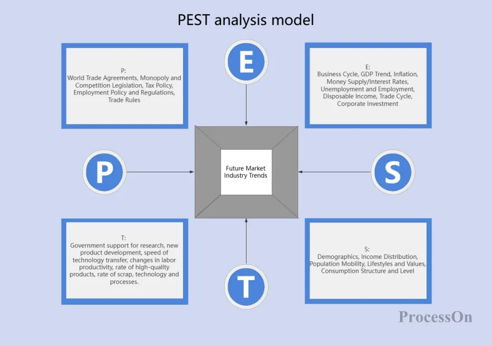 The PEST model focuses on macro-environmental analysis, taking a completely outward perspective to help companies understand the overall landscape of the external world. It systematically scans four dimensions—Political, Economic, Social, and Technological—for factors that are beyond a company's control but profoundly impact its survival and development. Through PEST analysis, companies can identify opportunities and threats in the external environment, providing a macro-context for strategic decision-making.