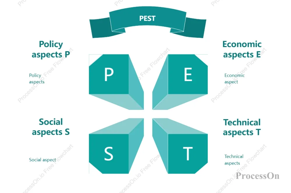 The key to creating a PEST model is to clearly present the four dimensions and their key factors, facilitating team discussion and reporting. A four-quadrant matrix diagram can be used to create the PEST model chart. Divide the canvas into four areas, labeling them P, E, S, and T respectively, and list the key factors in each area.