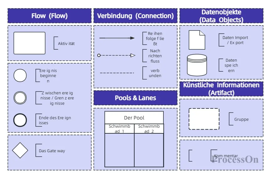 (2) Nachrichtenfluss: Verwenden Sie gepunktete Pfeile, um verschiedene Prozesspools zu verbinden und so die system-/abteilungsübergreifende Kommunikation anzuzeigen.