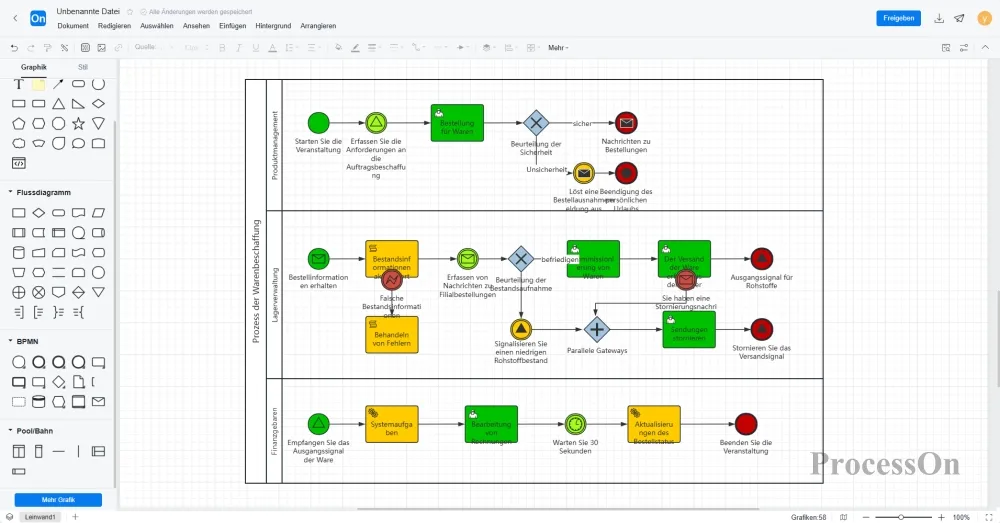 Hauptprozessdiagramm: Behalten Sie nur den Kernpfad bei (z. B. „Bestellung → Zahlung → Lieferung“) und verwenden Sie Unterprozesse oder Anrufaktivitäten, um komplexe Details zu verbergen.