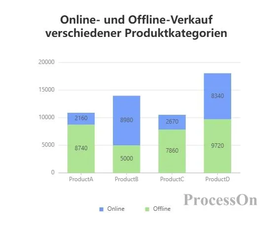 2D-gestapeltes Säulendiagramm: Rechteckige Balken verschiedener Reihen werden zusammen gestapelt. Die Höhe jedes rechteckigen Balkens stellt den Wert der Reihe in der Kategorie dar, und die Höhe der gesamten Spalte stellt die Summe der Werte aller Reihen in der Kategorie dar. Es wird häufig verwendet, um den Anteil jedes Teils am Ganzen und die Gesamtmenge des Ganzen anzuzeigen. Um beispielsweise die jährlichen Online- und Offline-Verkäufe verschiedener Produktlinien des Unternehmens anzuzeigen , stellt jede Produktlinie eine Kategorie und jeder Vertriebskanal eine Serie dar. Durch das zweidimensionale gestapelte Säulendiagramm können Sie die jährlichen Online- und Offline-Verkäufe jeder Produktlinie sowie die Änderungen der jährlichen Gesamtverkäufe deutlich erkennen.