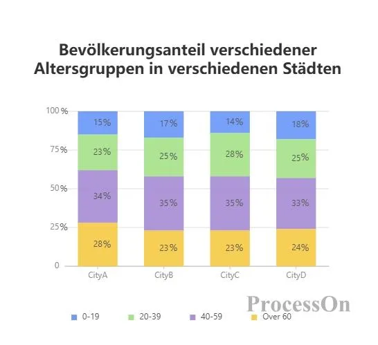 Ähnlich einem gestapelten Säulendiagramm, aber die Höhe jeder Säule beträgt immer 100 % und die Höhe jedes Serienbalkens stellt den Prozentsatz des Serienwerts in dieser Kategorie zum Gesamtwert dieser Kategorie dar. Der Schwerpunkt liegt auf der Darstellung des proportionalen Verhältnisses der Teile zum Ganzen und nicht auf den absoluten Werten. Wenn man beispielsweise den Bevölkerungsanteil jeder Altersgruppe in verschiedenen Städten analysiert, kann man den Anteil jeder Altersgruppe in verschiedenen Städten intuitiv anhand eines gestapelten prozentualen Säulendiagramms erkennen .