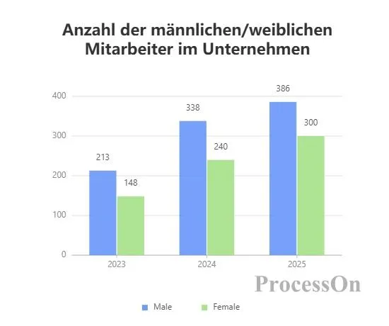 ordnet rechteckige Balken verschiedener Reihen in Gruppen an. Der rechteckige Balken in jeder Gruppe stellt eine Reihe dar und verschiedene Gruppen entsprechen verschiedenen Kategorien. Geeignet zum Vergleichen der numerischen Unterschiede zwischen Reihen in verschiedenen Kategorien. Um beispielsweise die Anzahl der männlichen und weiblichen Mitarbeiter in einem Unternehmen in verschiedenen Jahren zu vergleichen , stellt jedes Jahr eine Gruppe und jedes Geschlecht eine Reihe dar. Das gruppierte Säulendiagramm kann den Unterschied in der Anzahl männlicher und weiblicher Mitarbeiter in verschiedenen Jahren deutlich zeigen .