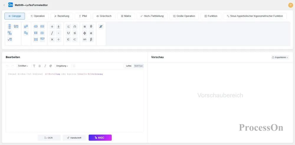 Besuchen Sie https://www.processon.io/de/latex und Sie sehen ein Schnittstellenlayout mit einem Eingabebereich auf der linken und einem Vorschaubereich auf der rechten Seite.