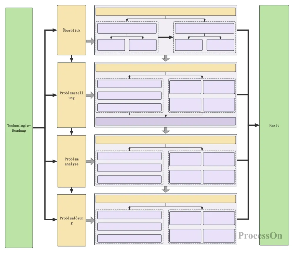 2. Bestimmen Sie das Gesamtlayout und den Stil der Technologie-Roadmap, z. B. durch die Verwendung von rechtwinkligen Rechtecken zur Darstellung wichtiger Technologieknoten und durch die Verwendung von Pfeilen zur Darstellung von Abhängigkeiten zwischen Technologien.