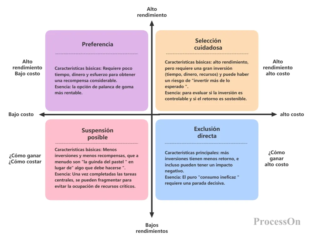 Una herramienta analítica de uso común es la matriz de costo-valor. El eje horizontal representa los niveles de costo y el eje vertical representa los niveles de contribución de ingresos, ubicando las actividades en cuatro cuadrantes: