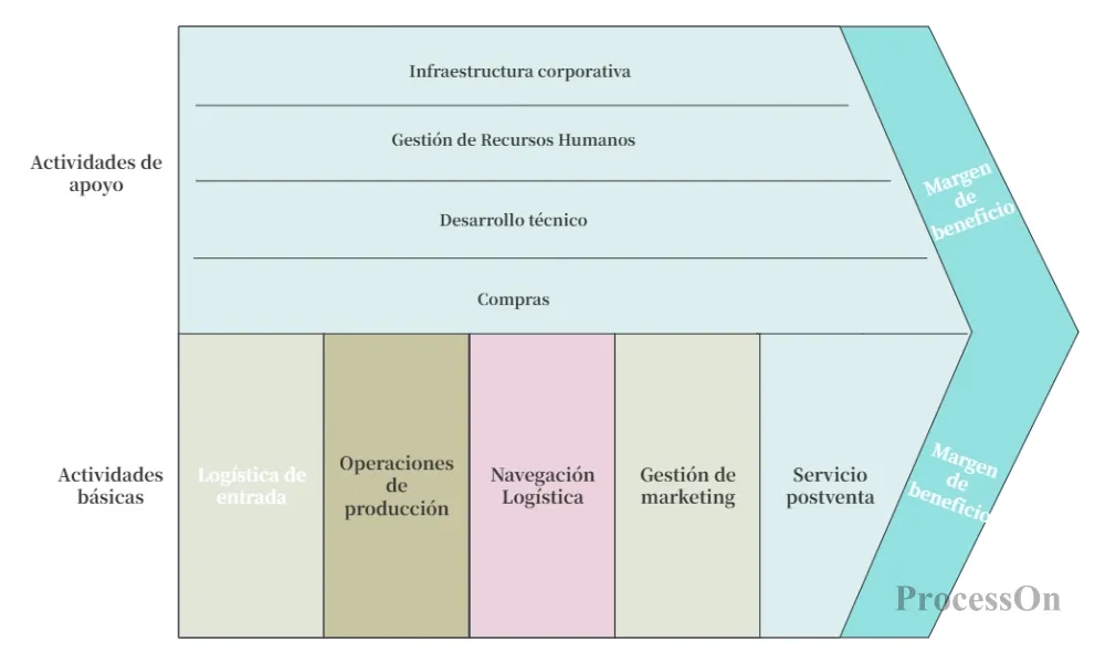 Organiza todas las actividades de tu empresa según las nueve categorías de Porter. Puedes usar mapas mentales o diagramas de flujo para representar la cadena de valor completa, desde las materias primas hasta el servicio posventa. ProcessOn ofrece plantillas de cadena de valor prediseñadas que puedes modificar fácilmente arrastrando y soltando elementos.
