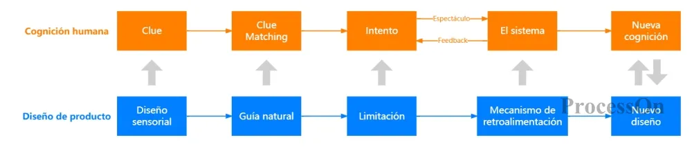 Este diagrama de flujo ilustra claramente la correspondencia entre la cognición humana y el diseño de productos: los humanos construyen nuevos conocimientos mediante la identificación de señales, la experimentación y la retroalimentación, mientras que el diseño de productos apoya el proceso cognitivo del usuario a través del diseño perceptivo, la guía natural y los mecanismos de retroalimentación, logrando así un ciclo iterativo de cognición y diseño. ProcessOn permite crear diagramas similares rápidamente; basta con visitar el sitio web oficial, registrarse, seleccionar una plantilla de diagrama de flujo, arrastrar y soltar elementos gráficos y conectar líneas para completar el proceso. También permite la edición colaborativa en tiempo real por equipos.