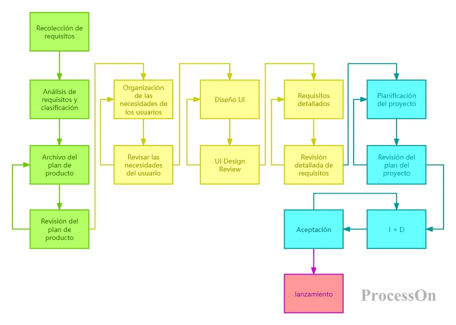 Esta plantilla utiliza distintos colores para diferenciar etapas como el procesamiento de requisitos, el diseño de la interfaz de usuario, el desarrollo del proyecto y la implementación. Los pasos y la lógica de cada etapa se visualizan claramente. Por ejemplo, se pueden revisar y optimizar los requisitos, y realizar ajustes si la aprobación del desarrollo no es satisfactoria. La biblioteca de plantillas de ProcessOn ofrece una gran cantidad de plantillas de flujo de trabajo profesionales que puede reutilizar directamente o modificar según las necesidades del proyecto. Una vez finalizada la creación, también puede exportarla en varios formatos, como PDF y PNG, para compartirla fácilmente con el equipo.