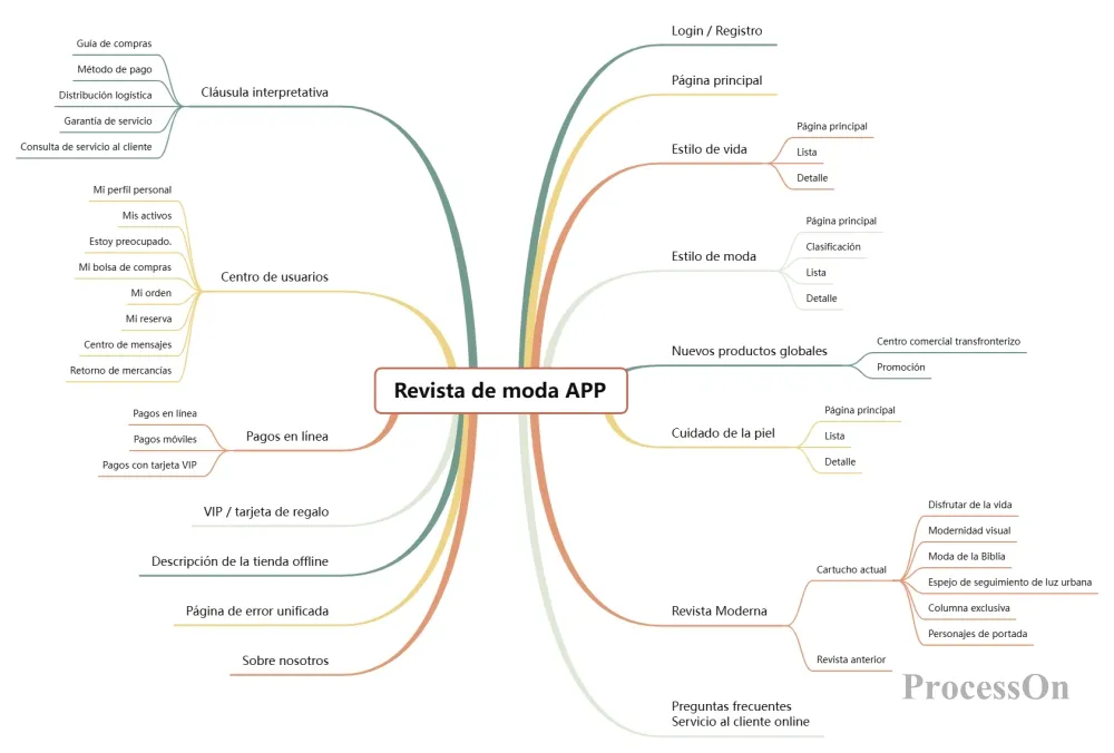 Tomando como ejemplo el diseño de una aplicación de revista de moda , el mapa mental se extiende desde el tema central hasta ramas como inicio de sesión/registro, página de inicio y estilo de vida . Cada rama se subdivide en detalles como funciones, procesos y roles, lo que permite visualizar claramente la arquitectura completa del producto. De esta forma, los desarrolladores conocen los límites de los módulos, los diseñadores la navegación entre páginas y los evaluadores la cobertura de los casos de prueba.