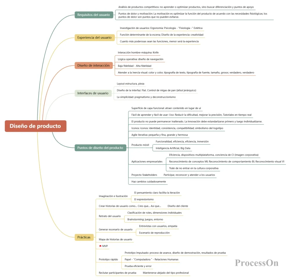 Este mapa mental describe sistemáticamente los elementos centrales del diseño de productos desde las perspectivas de las necesidades del usuario, la experiencia del usuario y el diseño de interacción, lo que lo hace adecuado para construir el marco general en las primeras etapas del diseño.