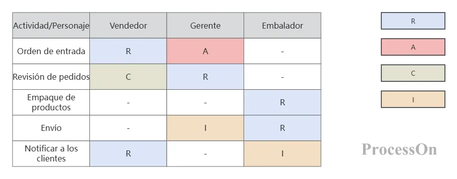 Ejemplo: Supongamos que tenemos un proceso comercial de compras en línea simple que involucra tres roles: vendedor, gerente y transportista. A continuación se muestra un ejemplo de un diagrama RACI para este proceso empresarial