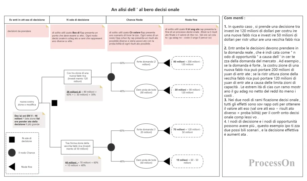 Nodi opportunità : rappresentati da nodi circolari, questi nodi simboleggiano eventi incerti o risultati sconosciuti . Confrontando gli effetti o gli stati economici di ciascun nodo opportunità e applicando determinati criteri decisionali, è possibile selezionare la soluzione ottimale o il percorso successivo.