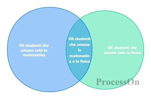Ad esempio, nel diagramma di Venn dell'insieme A (studenti a cui piace la matematica) e dell'insieme B (studenti a cui piace la fisica), la parte sovrapposta rappresenta "studenti a cui piacciono sia la matematica che la fisica", mentre la parte non sovrapposta rappresenta rispettivamente "studenti a cui piace solo la matematica" e "studenti a cui piace solo la fisica".