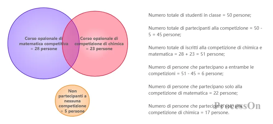 Tra i 50 studenti di una classe, 28 hanno scelto la gara di matematica , 23 hanno scelto la gara di chimica e 5 non hanno partecipato ad alcuna gara. Attraverso il diagramma di Venn è possibile stabilire il seguente modello:
