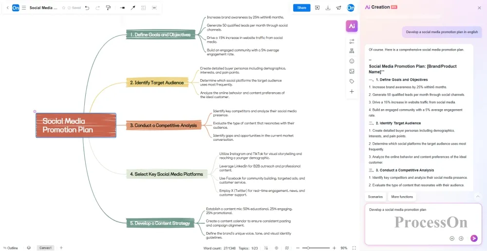 Mappe mentali generate dal testo: inserisci un argomento o un requisito (ad esempio "sviluppare un piano di promozione sui social media") e l'intelligenza artificiale genererà automaticamente una mappa mentale completa contenente rami principali e sottonodi.