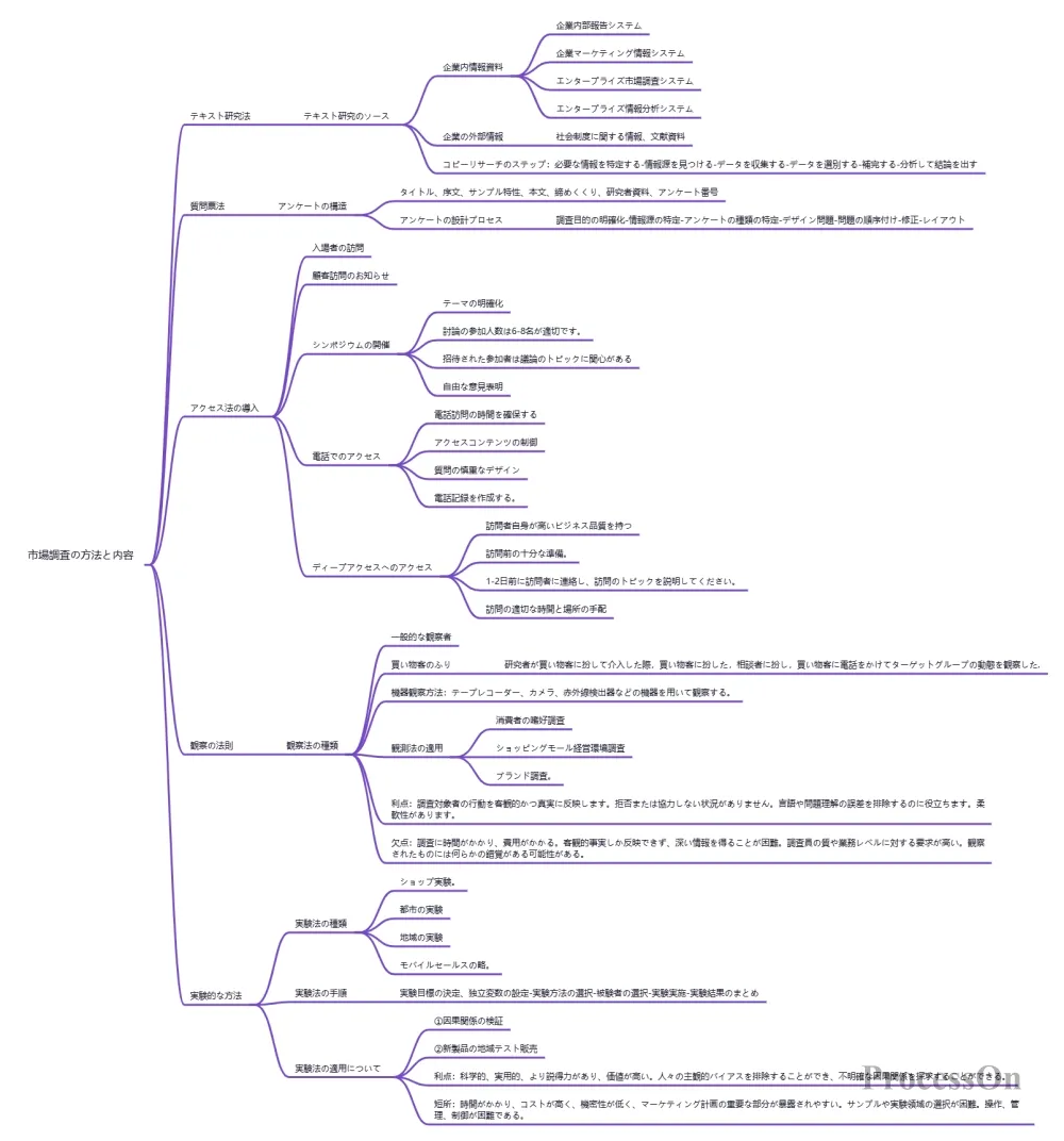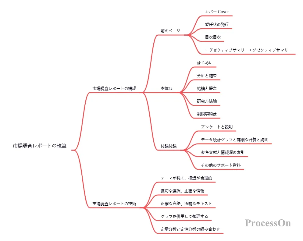 市場調査には数多くの手順、方法、資料が含まれるため、チームは細部に迷い込みがちです。そんな時、明確なマインドマップやフローチャートが「ナビゲーター」として役立ちます。