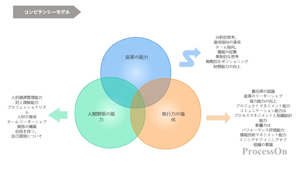 コンピテンシーモデルの中核は、職務に必要な能力と資質を定義することです。科学的なコンピテンシーモデルは、人材が職務要件を完全に満たせるよう、能力の複数の側面を網羅する必要があります。下の図は、コンピテンシーモデルの3つの主要なコンピテンシー側面、すなわち変化管理、対人スキル、および実行スキルを示しており、包括的なコンピテンシーモデルを構築するための明確な枠組みを提供します。