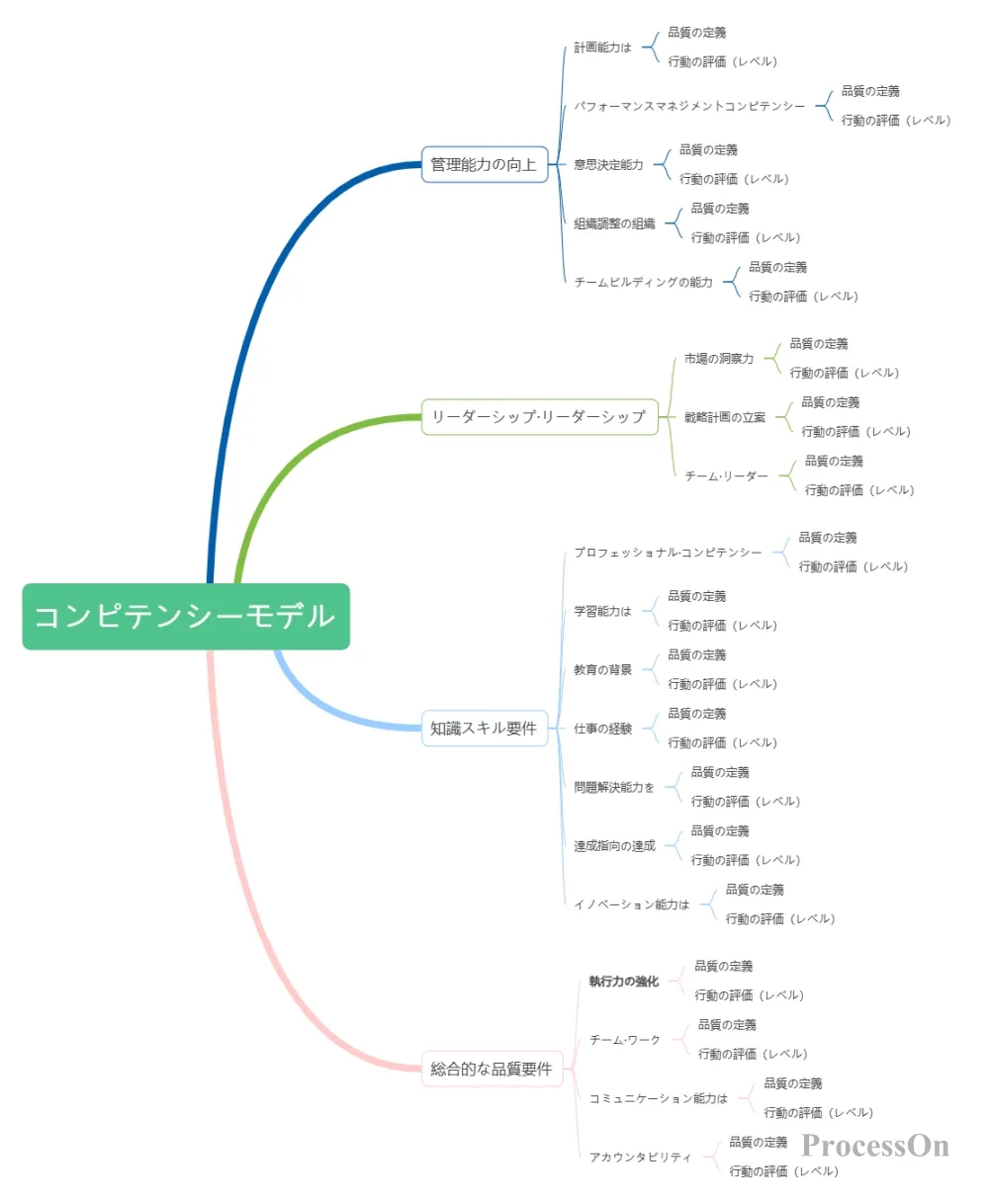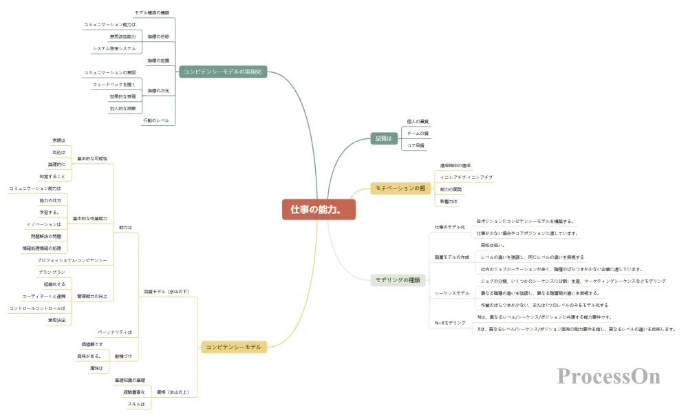 この階層化された詳細なコンピテンシーモデルは非常に実用的で、企業が抽象的なスキルや資質を具体的な行動基準へと変換するのに役立ち、人材採用、業績管理、研修・育成、その他のプロセスにおける明確な基盤を提供します。ProcessOnを使用してこのようなマインドマップを作成する際には、テンプレートライブラリから適切なマインドマップテンプレートを選択し、企業の具体的なニーズに合わせて修正・改善し、独自のコンピテンシー次元や行動基準を追加することができます。