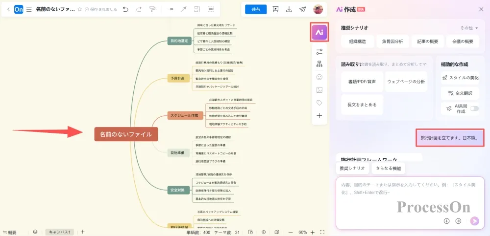 アイデアを整理し、視覚化するには、強力なダイアグラム作成ツールが不可欠です。ProcessOnは、複数人でのリアルタイムオンラインコラボレーションをサポートする、プロフェッショナルで強力なダイアグラム作成ツールです。マインドマップ、フローチャート、プロトタイプ、UML、BPMN、ネットワークトポロジー図など、さまざまなグラフィックの描画に使用できます。シンプルなインターフェース設計、スムーズな操作感、そして豊富でインテリジェントなコンテンツリソースは、ユーザーから高い評価を得ています。ProcessOnは優れたオンラインダイアグラム作成ツールであるだけでなく、AI機能との高度な統合により、視覚的思考という創造プロセスを再定義します。