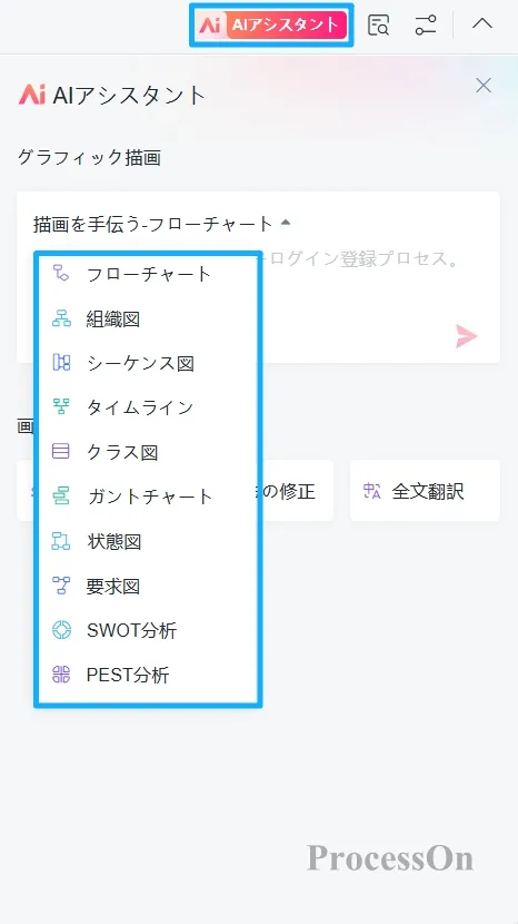フローチャート : フローチャート、アーキテクチャ図、シーケンス図、タイムライン、ガントチャート、UML 図、SWOT 分析、PEST 分析。