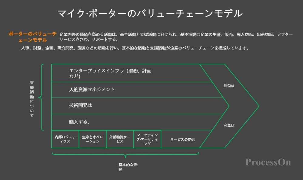 本日は、ポーターのバリューチェーンモデルの基本概念と、それを活用してビジネスの競争優位性を構築する方法について掘り下げていきます。さらに重要なのは、ProcessOnなどのチャート作成ツールを使ってバリューチェーンを視覚化する方法をご紹介し、チームに分かりやすく説明することで、戦略実行のための強固な基盤を築くことができる点です。