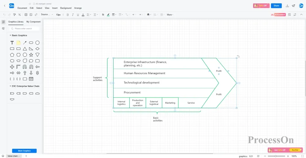 ポーターの9つのカテゴリーに基づいて、会社のすべての活動を整理しましょう。マインドマップやフローチャートツールを使えば、原材料からアフターサービスまでのバリューチェーン全体を図示できます。ProcessOnでは、ドラッグ&ドロップで簡単に編集できる既製のバリューチェーンテンプレートを提供しています。
