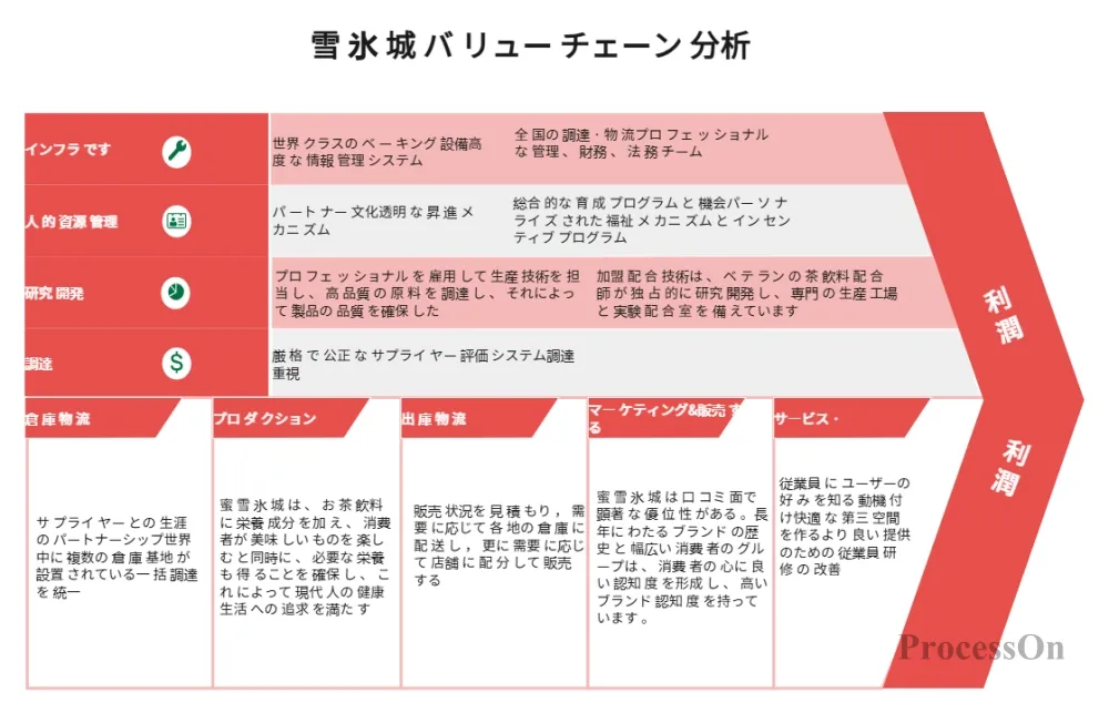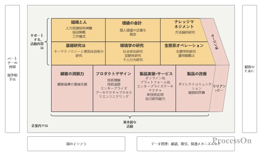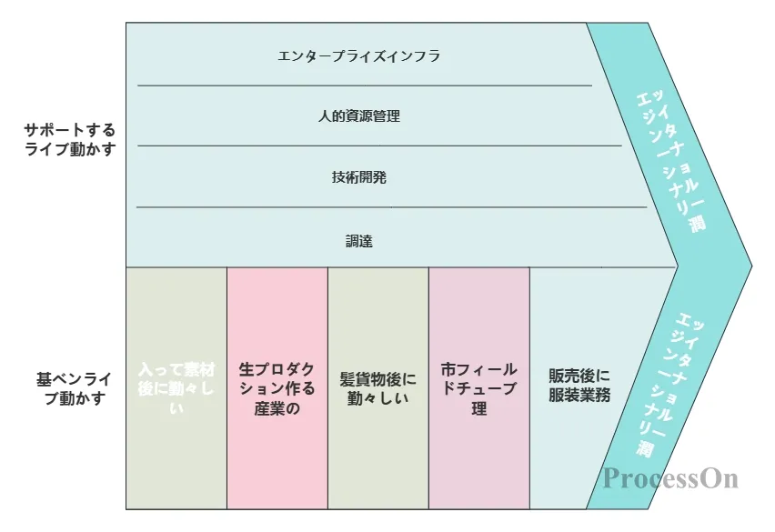 支援活動:基本的な活動に必要なインフラとリソースを提供する活動。これには、調達、技術開発、人材管理、企業インフラなどが含まれる。