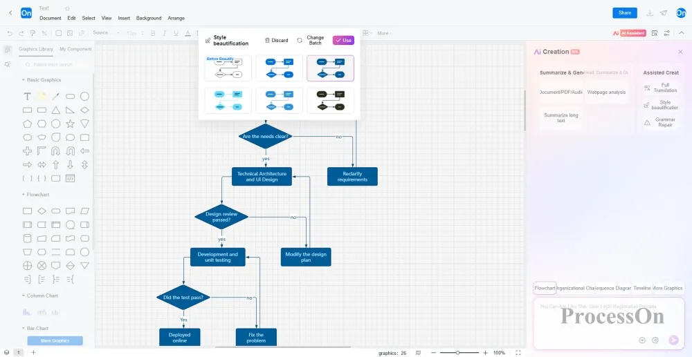 1. フローチャート、 UMLダイアグラム、ガントチャートといった複雑で多様な種類のチャートは、しばしば手に負えないと感じることがあります。そのような場合、ProcessOn AIは、ユーザーがニーズを簡単に説明し、学習や参照用にプロフェッショナルな外観のチャートを生成するのに役立ちます。