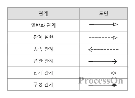 의존성: 메서드 매개변수가 다른 클래스를 사용하는 경우와 같이 일시적인 사용 관계를 나타냅니다. 점선 화살표로 표시됩니다.