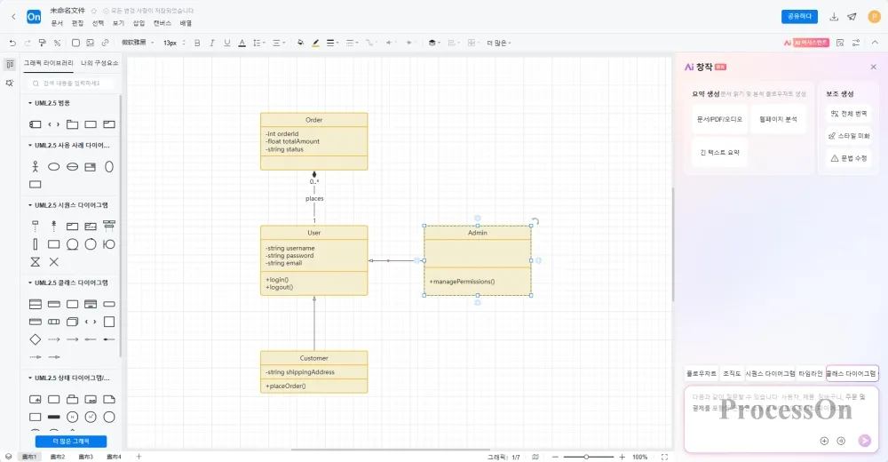 AI가 생성한 클래스 다이어그램은 세 클래스 간의 관계를 명확하게 보여줍니다. User와 Order는 선으로 연결되어 있고, Order와 Product는 중간 클래스인 OrderItem을 통해 다대다 관계를 맺고 있습니다. 속성과 메서드의 가시성 또한 자동으로 표시됩니다. 단 몇 분 만에 설계 문서에 바로 사용할 수 있는 전문적인 클래스 다이어그램을 얻을 수 있습니다.
