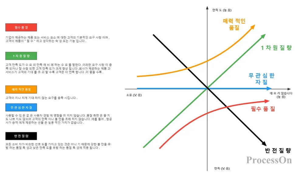 기본 요구 사항: 제품이 반드시 갖춰야 할 요소들입니다. 이러한 요소들이 없으면 사용자들이 불만을 제기할 것이고, 갖춰 놓으면 사용자들은 당연하게 여길 것입니다 (예: 전자상거래 앱의 결제 기능).