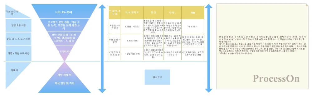 이 템플릿은 왼쪽에 깔때기 모양 구조를 사용하여 기본 요건부터 핵심 역량까지 선별 과정을 명확하게 보여줍니다. 최상위 단계인 기본 요건에는 나이, 학력 등 기본적인 조건이 포함되어 인재 선발의 첫 번째 관문 역할을 합니다. 중간 단계인 일반 및 자원 요건에서는 해당 직무에 필요한 경험과 업계 자원을 더욱 세분화합니다. 최하위 단계인 성장 잠재력에서는 인재의 장기적인 성장 가능성에 초점을 맞춰 회사의 장기 투자 관점을 반영합니다. 이러한 깔때기 모양의 선별 논리는 기업이 인재 풀을 점진적으로 좁혀나가고 채용 효율성을 높이는 데 도움이 됩니다.