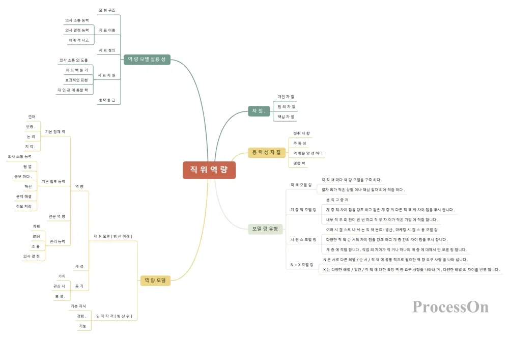 직무 역량은 명시적인 지식과 기술뿐만 아니라 암묵적인 자질과 동기까지 포함하는 복잡한 시스템입니다. 아래 마인드맵 템플릿은 직무 역량의 구성 요소를 다양한 차원에서 분석하여, 이를 포괄적으로 이해할 수 있는 풍부한 관점을 제공합니다.