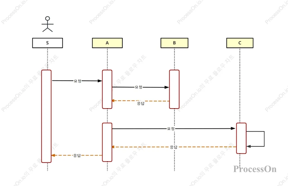 동기 메시지(실선 화살표): 전송 후 응답을 기다려야 합니다(예: API 호출).