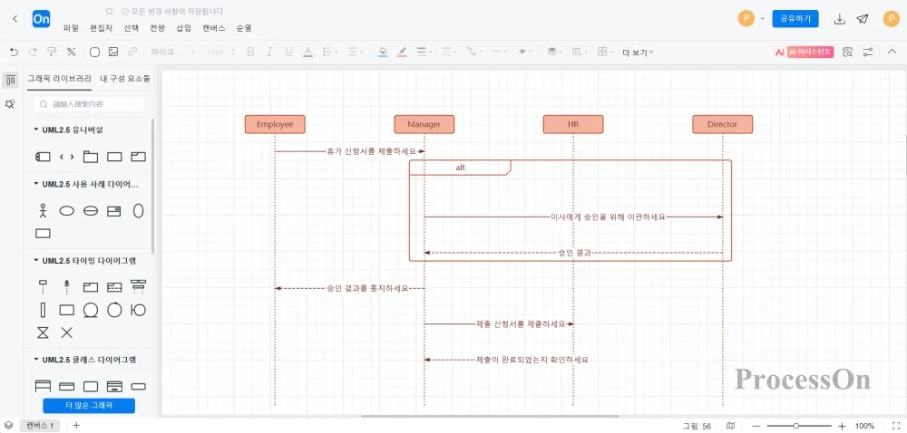 지시를 받은 후, AI는 10초 이내에 논리적으로 명확하고 구조적으로 완벽하며 UML 사양을 준수하는 시퀀스 다이어그램을 생성합니다.