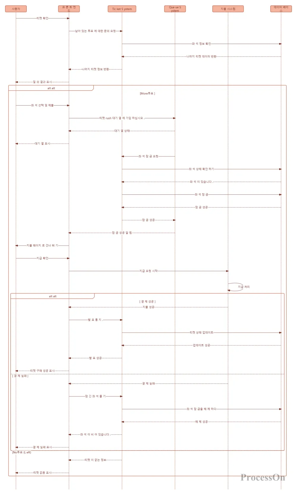 사용자는 먼저 티켓 구매 가능 여부를 확인합니다. 티켓이 있는 경우 구매를 확정하고 좌석 확보 대기열에 들어갑니다. 좌석 확보가 성공적으로 완료되면 결제 페이지로 이동합니다. 결제가 성공하면 티켓이 발급되고 상태가 업데이트됩니다. 결제가 실패하거나, 티켓이 없거나, 좌석 확보에 실패하면 좌석은 자동으로 해제되고 실패 알림이 전송됩니다. 이로써 조회부터 티켓 발급, 그리고 비정상적인 상황 발생 시 롤백까지 모든 과정이 원활하게 진행됩니다.