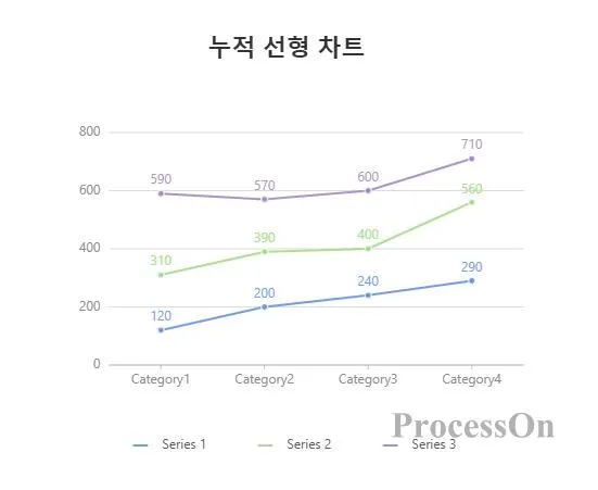 특징: 쌓인 막대형 차트와 비슷하지만 선 형태로 표시되며, 각 선은 데이터 집합을 나타내고 선 사이의 영역은 누적 값을 나타내도록 채워집니다.
