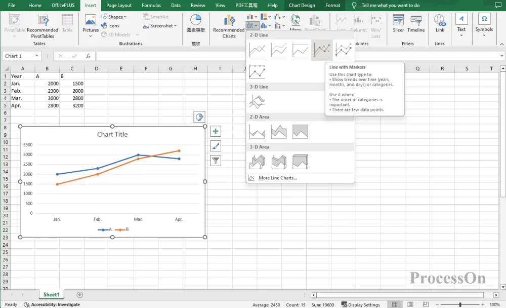 3. 차트 삽입: '삽입' 탭을 클릭하고 '선형 차트' 유형을 선택한 다음 드롭다운 메뉴에서 적절한 선형 차트 스타일을 선택합니다.