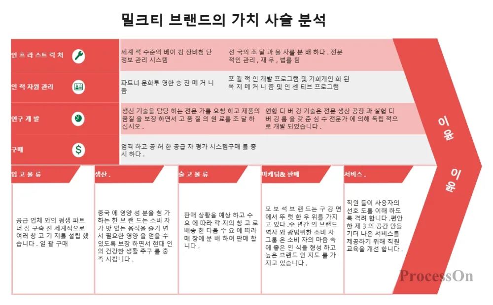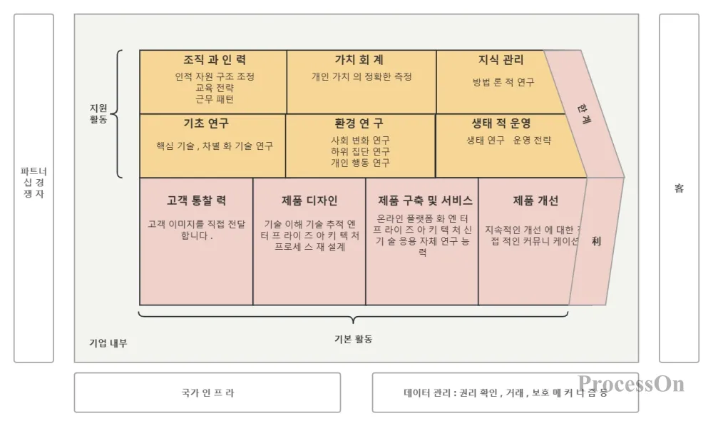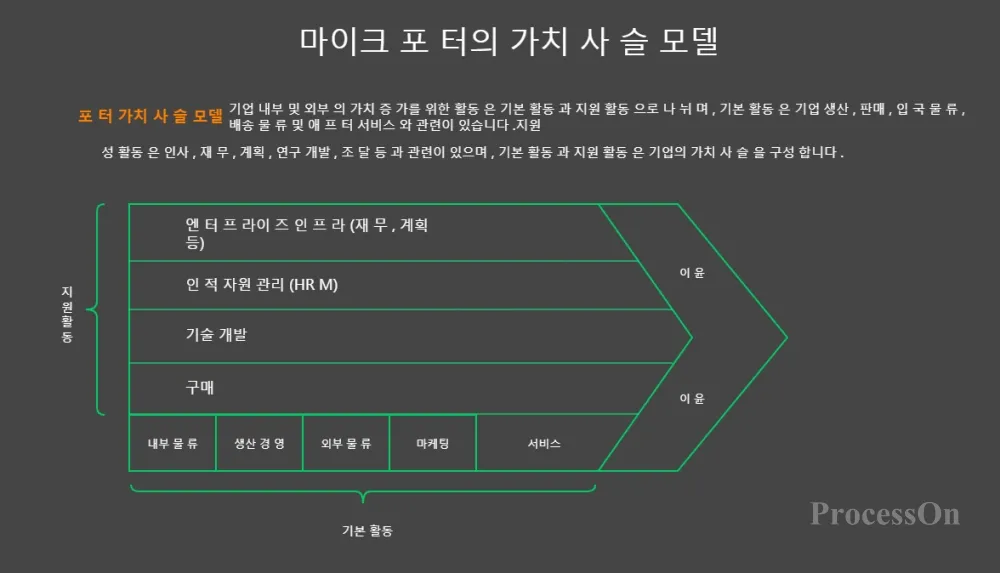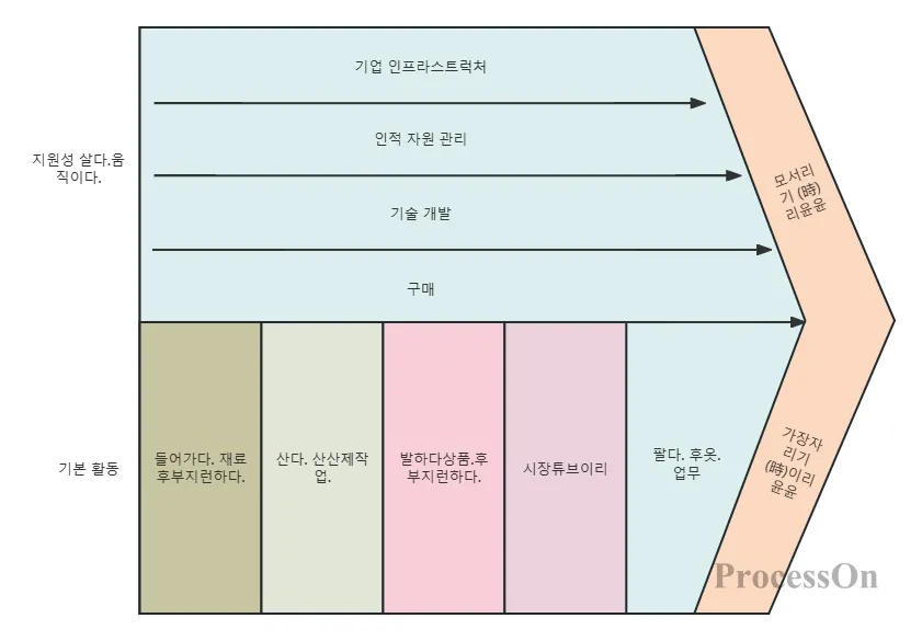 지원 활동: 기본 활동에 필요한 인프라와 자원을 제공하는 활동입니다. 여기에는 조달, 기술 개발, 인적 자원 관리 및 기업 인프라가 포함됩니다.