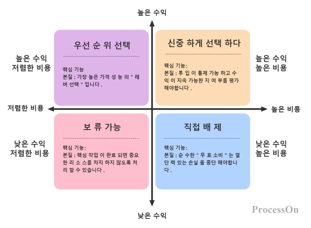 일반적으로 사용되는 분석 도구는 비용-가치 매트릭스입니다. 가로축은 비용 수준을 나타내고 세로축은 수익 기여 수준을 나타내며, 활동을 네 개의 사분면으로 분류합니다.
