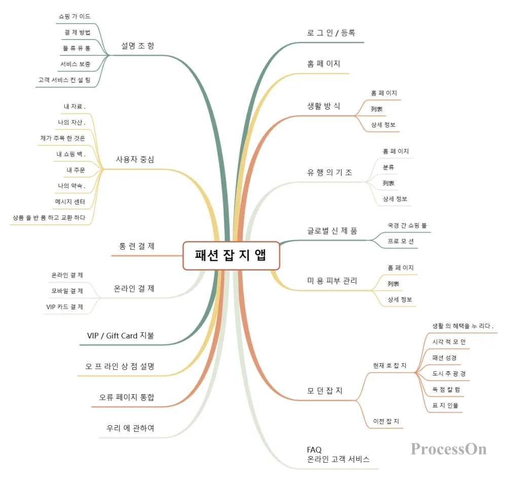 패션 잡지 앱 의 제품 디자인을 예로 들면 , 마인드맵은 중심 테마에서 로그인/회원가입, 홈페이지, 라이프스타일 등의 가지로 뻗어 나갑니다 . 각 가지는 기능, 프로세스, 역할 등의 세부 사항으로 세분화되어 전체 제품 아키텍처를 명확하게 보여줍니다. 이를 통해 개발자는 모듈 경계를, 디자이너는 페이지 탐색 방식을, 테스터는 테스트 케이스 범위를 파악할 수 있습니다.